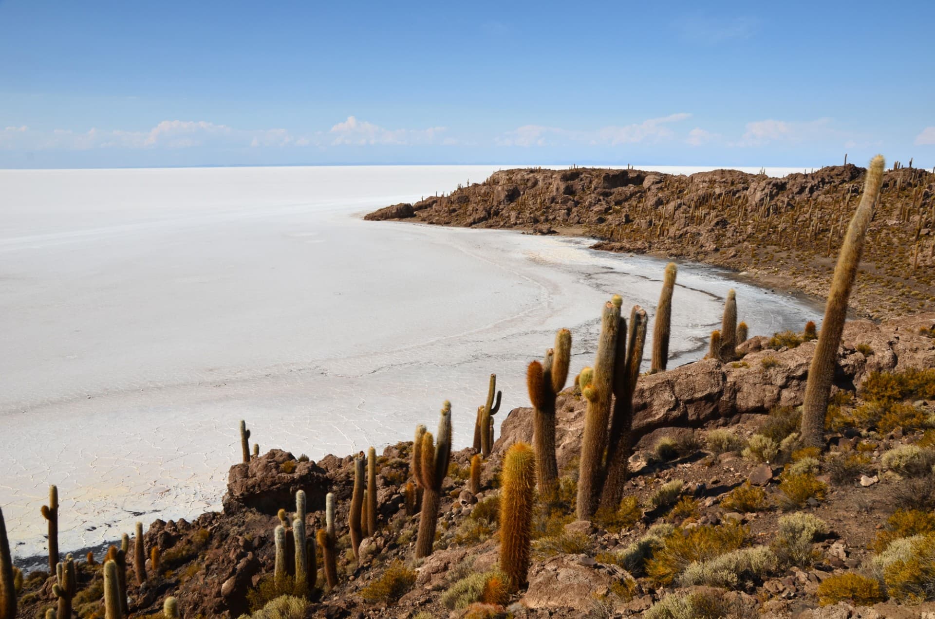 Almuerzo tipo picnic incluido al aire libre en medio del Salar de Uyuni. Visita de la Isla Incahuasi (la casa del Inca en idioma quechua), la isla más espectacular de todo el Salar. Esta isla ofrece a los visitantes una vista cautivadora y un paisaje sorprendente, que demuestra la importancia cultural de la misma a pesar de estar rodeada por la inmensidad del Salar. Tiene una superficie de roca volcánica y está vigilada por cactus gigantes de más de 8 metros de altura. Se prevén momentos para realizar sesiones de fotos en perspectiva, sobre la inmensidad blanca antes de regresar a Uyuni.